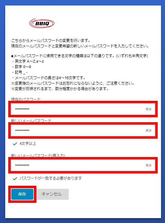 BBIQメールパスワードの変更方法を教えてください。 QTnet会員専用ページ、またはWebメールからお手続きいただけます。 QTnet会員専用ページでの変更方法 1 QTnet会員専用ページにログイン後、上部メニューの[ ご契約サービス ]を選択し、「ご利用中の電子メール」にある[ 確認する ]を選択します。 2 現在ご利用中のBBIQメールアドレスの一覧から、BBIQメールパスワードを変更したいBBIQメールアドレスの[ 変更する ]を選択します。 3 パスワードを設定・変更するBBIQメールアドレスを確認します。 「その他のオプションサービス一覧」にあるメールパスワード変更の[ 変更 ]を選択します。 4 新しいパスワードを入力して、[ 上記の内容で変更する ]を選択します。 BBIQメールパスワードについて BBIQメールパスワードの文字数は4文字以上、16文字以内です。 使用できる文字は、アルファベットと数字です。 アルファベットは大文字/小文字を区別します。 5 BBIQメールパスワード変更の完了です。 パスワードの変更が反映されるまで、10~30分ほどかかります。 メールアプリへアカウント設定済みの場合、変更反映後に設定変更をお願いします。 メールソフトの設定変更について メールパスワード変更後、お客さまがご利用中のメールソフトの設定を変更する必要があります。 メールパスワード変更後の設定方法 Topへ Webメールでの変更方法 1 パスワードを変更したいメールアドレスでWebメールにログイン後、 画面右上のメールアドレス横の[ ▼ ]を選択します。 ※ スマートフォン版では設定できませんので、パソコン版でログインしてください。 2 [ パスワードを変更 ]を選択します。 3 「現在のパスワード」「新しいメールパスワード」「新しいメールパスワード(再入力)」を入力して、[ 保存 ]を選択します。 現在のメールパスワード :現在利用中のメールパスワード 新しいメールパスワード :変更後のメールパスワード 新しいメールパスワード(再入力) :[ 新しいメールパスワード ]に入力した同じ文字列 4 メールパスワードの変更が完了しましたとの画面が表示されます。 以上で、完了です。 メールソフトの設定変更について メールパスワード変更後、お客さまがご利用中のメールソフトの設定を変更する必要があります。 メールパスワード変更後の設定方法 Topへ お役に立ちましたか? 役に立った 役に立たなかった 改善のため、「よくあるご質問」へご意見をお寄せください いただいたご意見・ご要望については、お客さまに直接ご回答を差し上げることができません。 回答をご希望される場合は、お問合せ受付フォームをご利用ください。 回答する アンケートにご協力ありがとうございました