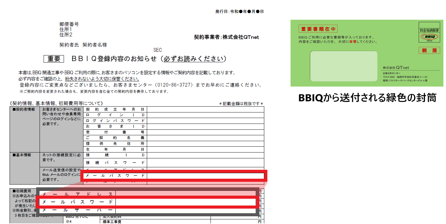 「BBIQ登録内容のお知らせ」は、ご契約お申込み後に「緑色の封筒」にてお届けいたします。