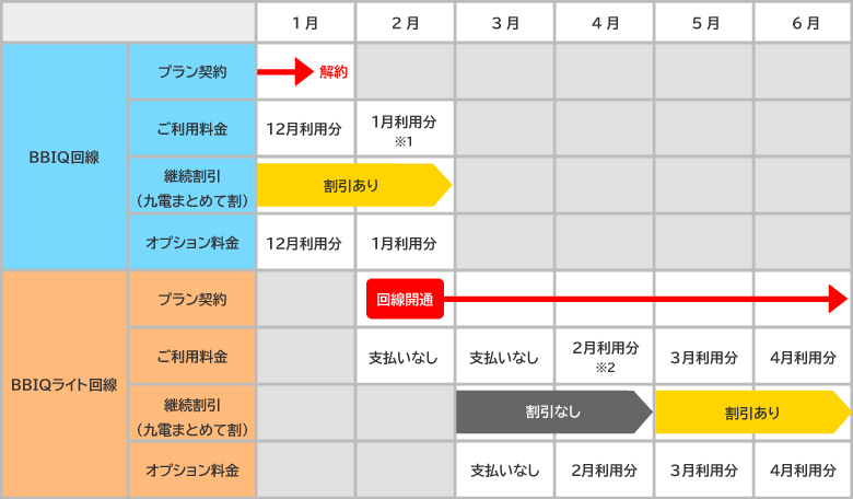 (例)BBIQを1月末解約、BBIQライトを2月開通の場合