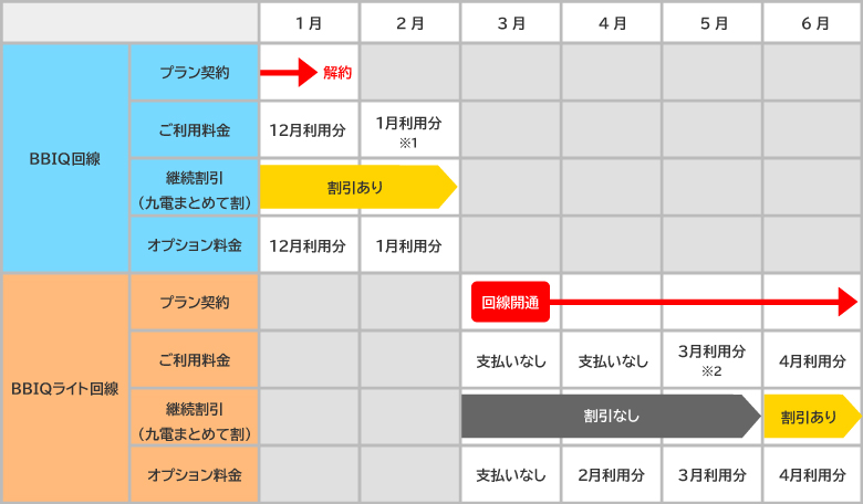 (例)BBIQを1月末解約、BBIQライトを3月開通の場合