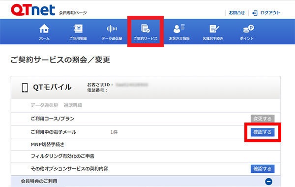 QTnet会員専用ページにログイン後、上部メニューの[ ご契約サービス ]を選択し、「ご利用中の電子メール」にある[ 確認する ]を選択します。