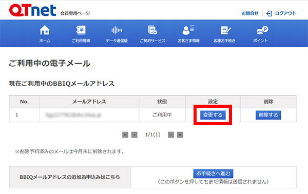 現在ご利用中のBBIQメールアドレスの一覧から、BBIQメールパスワードを変更したいBBIQメールアドレスの[ 変更する ]を選択します。