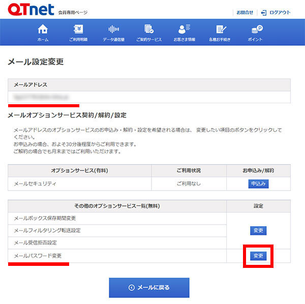 パスワードを設定・変更するBBIQメールアドレスを確認します。 「その他のオプションサービス一覧」にあるメールパスワード変更の[ 変更 ]を選択します。