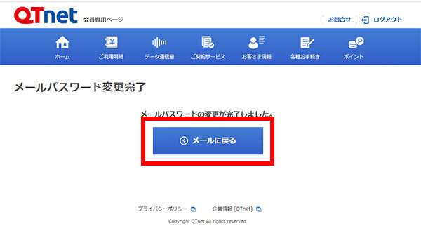 メールパスワードの変更が完了しましたとの画面が表示されます。 以上で、完了です。
